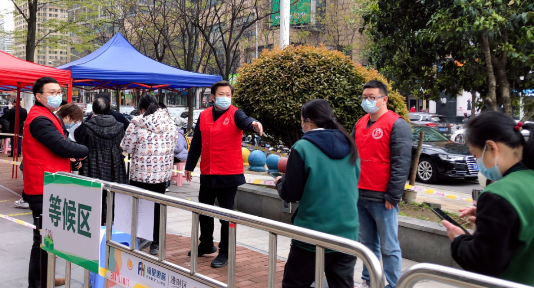 永业行青年志愿者助力社区核酸检测工作 2022-03-23 为坚决阻断疫情传播渠道,科学精准有效防控疫情,切实保障人民群众生命安全和身体健康,武汉市自3月23日起迅速启动新一轮核酸检测。为支援社区核酸检测工作,永业行党委、青年委员会组织8名志愿者,在副总裁程为民带领下前往武昌区徐家棚街道水岸国际社区2个检测点开展志愿服务工作。志愿者们秉承着“奉献、友爱、互助、进步”的志愿者精神,冲锋在前,“疫”无反顾,为社区防疫增添一抺青春亮色。 志愿者们来到核酸检测点后,立即开展相关志愿服务,有的维持核酸检测队伍秩序,有的帮助老人和孩子注册健康码和行程码,有的引导检测人群入场,帮助居民尽快完成核酸检测。在他们的耐心引导下,检测现场秩序井然有序,检测效率 MORE