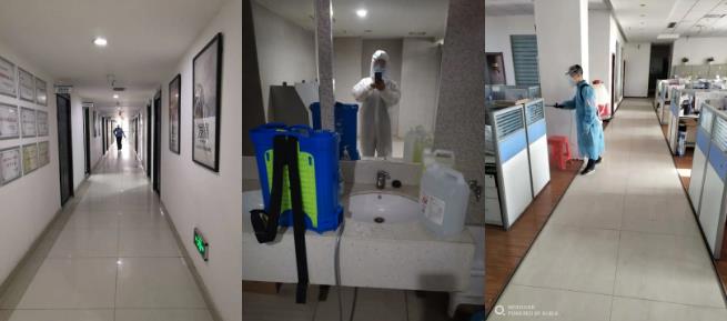 严格排查登记每位返岗员工的外出史和接触史,确保复工员工的身体健康。在办公楼入口处设置体温测量专区,对到岗员工进行测量体温、扫码登记、酒精消毒等,体温符合标准且佩戴口罩的员工才能进入办公楼。实行A/B两组人员间隔上岗工作制,在保证各项工作正常开展的前提下,做到复工后第一阶段的14天内A/B两组人员不见面,最大限度减少感染风险。严格控制现场会议,采用视频、语音等线上方式。此外,为避免下班时人流密集,提前一小时下班,并由值班人员再次进行体温测量登记后离开办公区。安排专职人员每天下班后,对门厅、楼道、会议室、电梯、楼梯、卫生间以及临时隔离间进行全面消杀,并做好消杀登记。