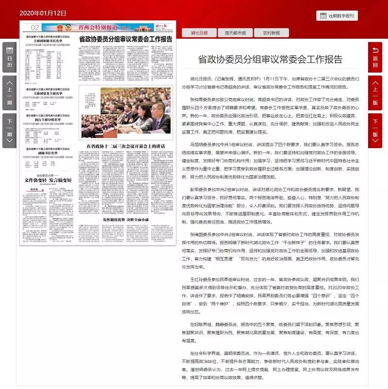 2020年1月11日至15日,政协湖北省十二届三次会议在武汉召开。省政协委员、省房协会长、永业行董事长兼总裁潘世炳参加会议,并向大会提交了《关于推进湖北省实施生态补偿的建议》《关于推进国土空间规划的几个建议》《关于湖北省落实<优化营商环境条例>的几点建议》《深化区域协同 推动鄂黄黄临空协同发展轴建设的几点建议》等多份提案,人民网、《中国经营报》、《湖北日报》、湖北广电、湖北之声、长江云等多家媒体从多个角度对潘世炳委员的提案进行了深度挖掘和报道。