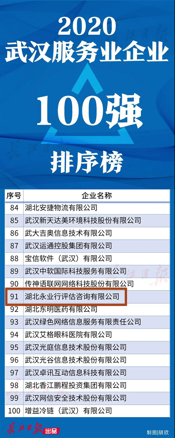 永业行荣登“2020年武汉服务业企业100强”榜单