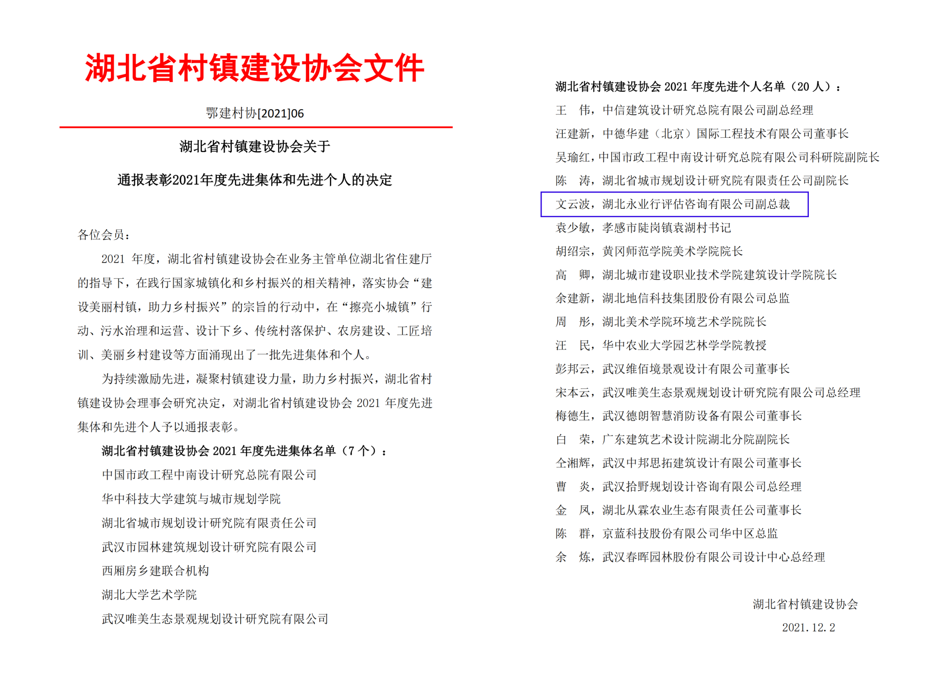 2021年12月7日,湖北省村镇建设协会(下称“协会”)2021年会暨村镇建设经验专题分享会在武汉召开。湖北省住建厅村镇处相关领导、协会会长孟勇、各会员单位以及省内相关市州村镇建设主管部门有关同志参加会议。协会副会长、永业行副总裁文云波参加会议并获评“湖北省村镇建设协会2021年度先进个人”。