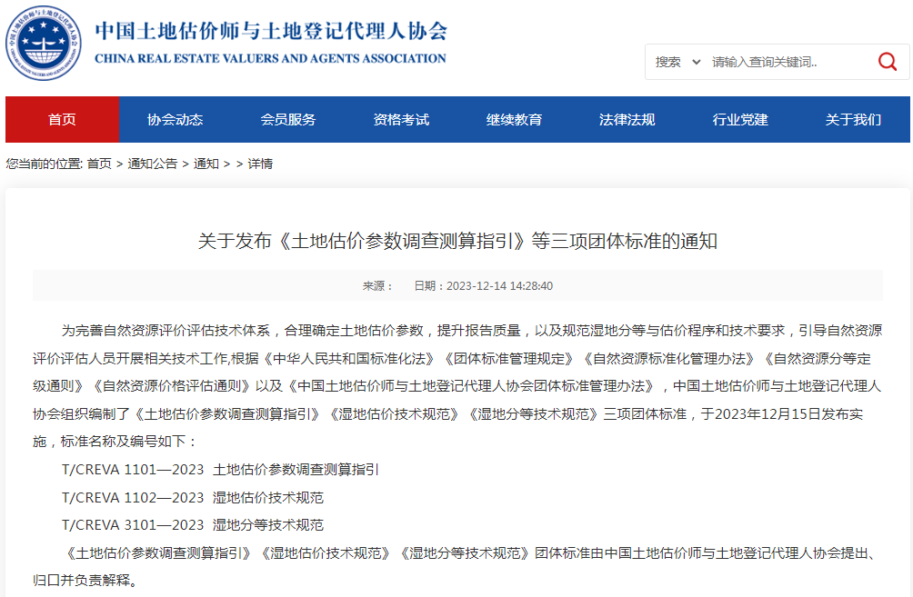 12月14日,中国土地估价师与土地登记代理人协会(以下简称“中估协”)发布三项团体标准,永业行参编的《土地估价参数调查测算指引》(T/CREVA 1101—2023)于2023年12月15日发布实施。
