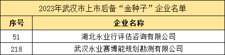 近日,2023年武汉市上市后备“金种子”“银种子”企业名单公布,其中湖北永业行评估咨询有限公司、武汉永业赛博能规划勘测有限公司再次成功入选上市后备“金种子”企业。