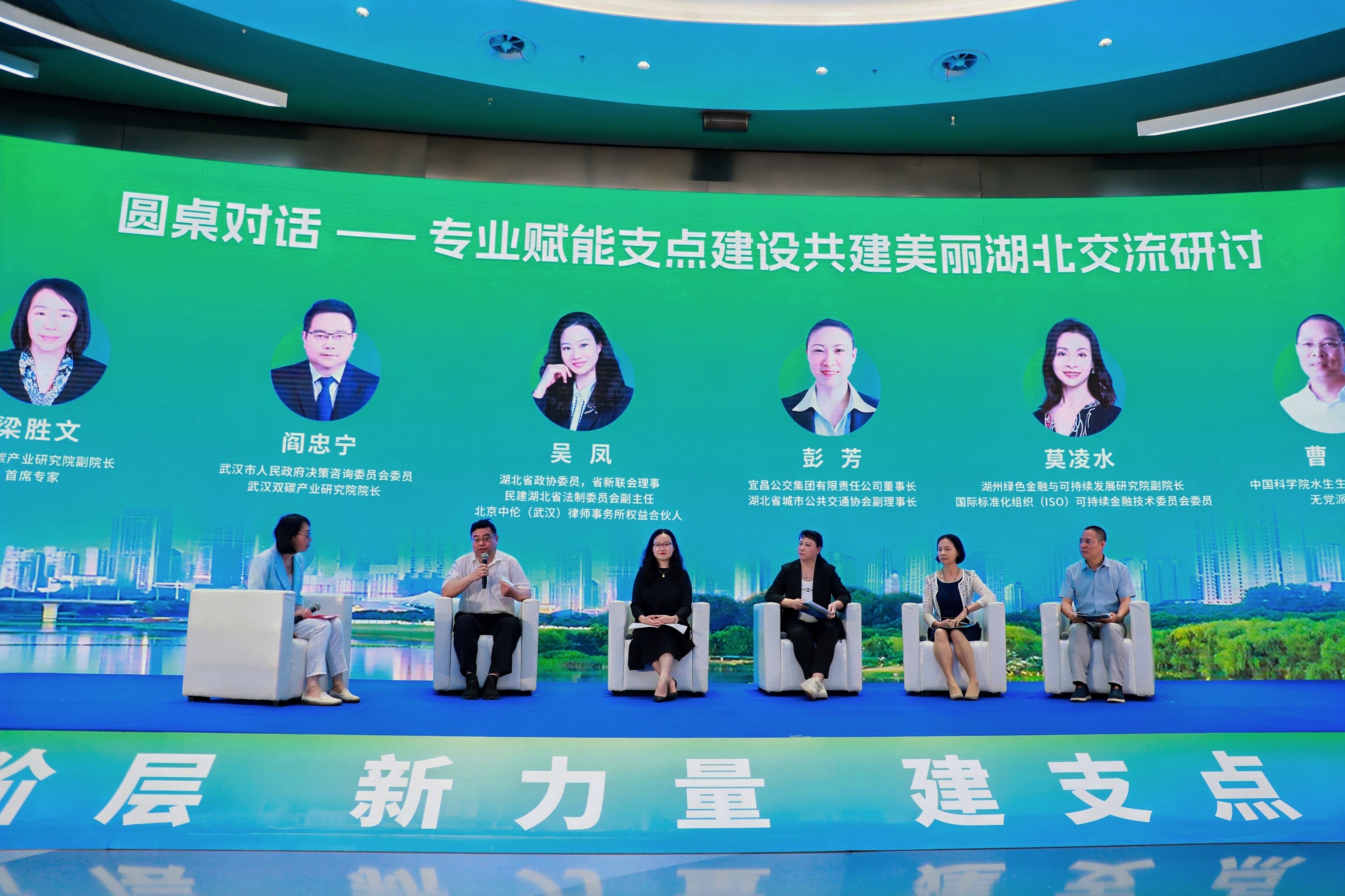 武汉双碳产业研究院副院长、首席专家梁胜文主持本环节。会议邀请武汉市人民政府决策咨询委员会委员,武汉双碳产业研究院院长阎忠宁;湖北省政协委员,省新联会理事,民建湖北省法制委员会副主任,北京中伦(武汉)律师事务所权益合伙人吴凤;宜昌公交集团有限责任公司董事长,湖北省城市公共交通协会副理事长彭芳;湖州绿色金融与可持续发展研究院副院长,国际标准化组织(ISO)可持续金融技术委员会委员莫凌水;中国科学院水生生物研究所研究员,无党派人士曹特等五位专家参加圆桌对话,围绕新阶层专业赋能支点建设共建美丽湖北交流研讨。